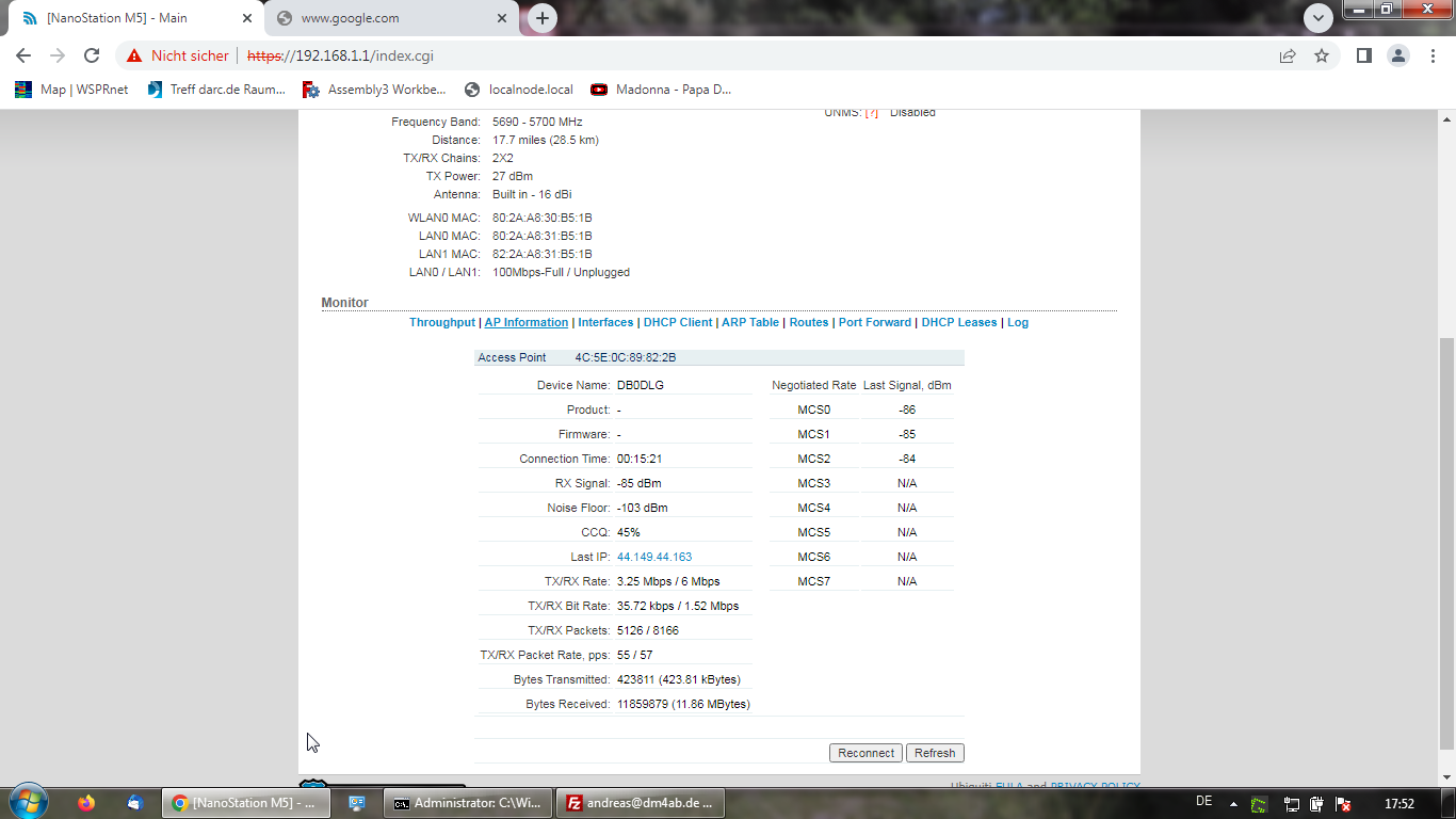 Draußenfunken in Albeck - DM4AB - 18-03-2023 Hamnet-Pirsch: Bericht vom Draußenfunken 17. März, Höhe vor Albeck Ich war heute Nachmittag bei noch schönem Sonnenschein auf der Pirsch nah Signalen aus Günzburg oder Dillingen (Meteoturm). Mit dabei ein Laptop, eine Nanostation M5, ein Fahrradmontage-Ständer und 4 Bundeswehr GFK-Stangen. Mehr dazu auf den Bildern im Anhang. Die genaue Funk-Location war hier: https://goo.gl/maps/UD6SPPbaksHuwEE1A Zunächst habe ich versucht, mit 2m Mast Signale zu erhaschen, dann mit 4m Mast. wesentliche Unterschiede waren nicht zu erkennen. Generell funktionierte die Verbindung nur lückenhaft, das Laden einer Google Seite mittels Browser (http) war nicht möglich, ftp Verbindungen funktionierten aber trotzdem zeitweise mit ~150kByte/sec. Ein Upload war schwierig, der Download funktionierte oft deutlich besser. Der Grund dafür liegt vermutlich in den vielen einzelelemente, die für eine Google Seite geladen werden müssen. Bliebt ein paket hängen, hängt die ganze Seite. ftp mittels FileZilla schien da deutlich zuverlässiger und lieferte oft ein gutes Ergebnis. Scanergebis bei 2m Aufbauhöhe (S/N) bzw. 4m (s/N) Höhe und (Kanal) HAMNET-DB0DLG-DB0GZL -82/-102 -80/-103 135 HAMNET-DB0DLG-USER5 -86/-103 -85/-102 139 HAMNET-DB0GZL-USER5 -84/-102 -84/-102 147 Typischer Verlauf eines Downloads im Ubiquiti Panel: Verteilung der erreichten Modulationsmodi (=gemischt, einfache Modi): meine Sendeleistung: 27dBm, Gewinn 15dBi (EIRP 42dBm) für MCS0 bei NS5M erforderlich nach Datenblatt: -96dBm, für MCS5: -83dBm Meteoturm: 30dBm, 12dBi (=EIRP 42dBm) für MCS0 erforderlich: -93dBm (angeblich weniger empfindlich als NS5M?) meine Interpretation: