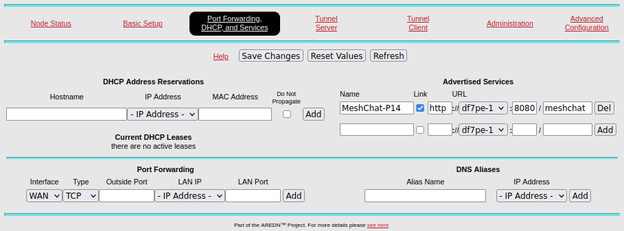 DNS Aliases: Hier Adress Aliase eintragen von Servern hinter dem Router die im Mesh Netz bekannt sein sollen. Z.B. der Server df7pe-xubuntu