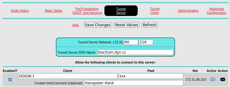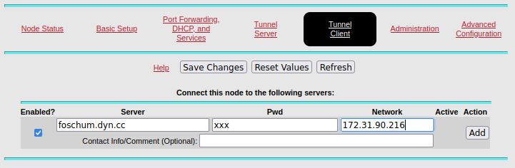 Eigentlich nur eine Notlösung da der Tunnel über das Internet geht und im Notfall nicht zur Verfügung steht aber eine tolle Sache zum mit der SW das Laufen zu lernen. Ihr müsst an den Tunnelbetreiber eine Mail schicken mit eurem Node Namen. Der trägt den Tunnel dann eine und schickt euch die Zugangsdaten.
