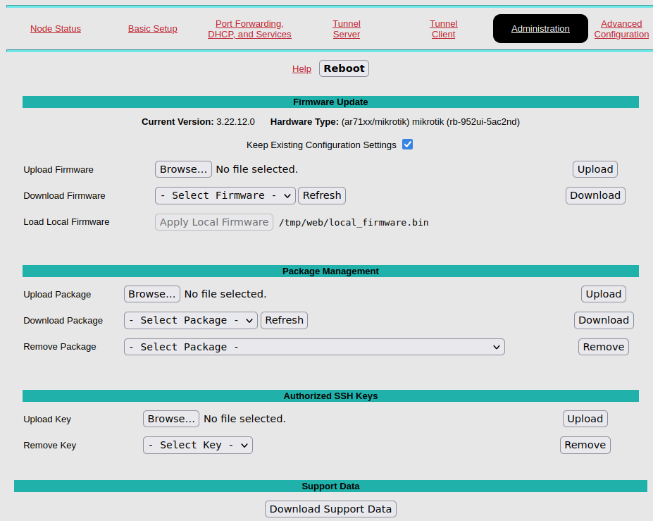 Hier kann neue Firmware aufgespielt werden und Pakete installiert werden z. B MeshChat