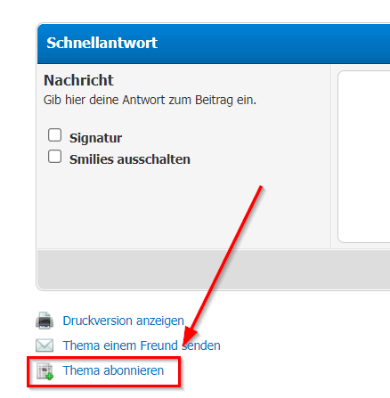 Damit ihr über Neuigkeiten auf dem laufenden bleibt, oder ein Thema gezielt verfolgen könnt ohne ständig im forum nachsehen zu müssen, könnt ihr einen einzelnen Beitrag oder ein ganzes Forum abonnieren.